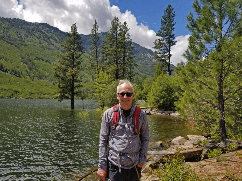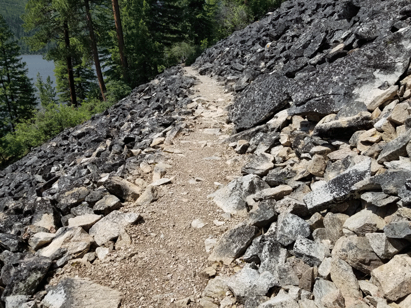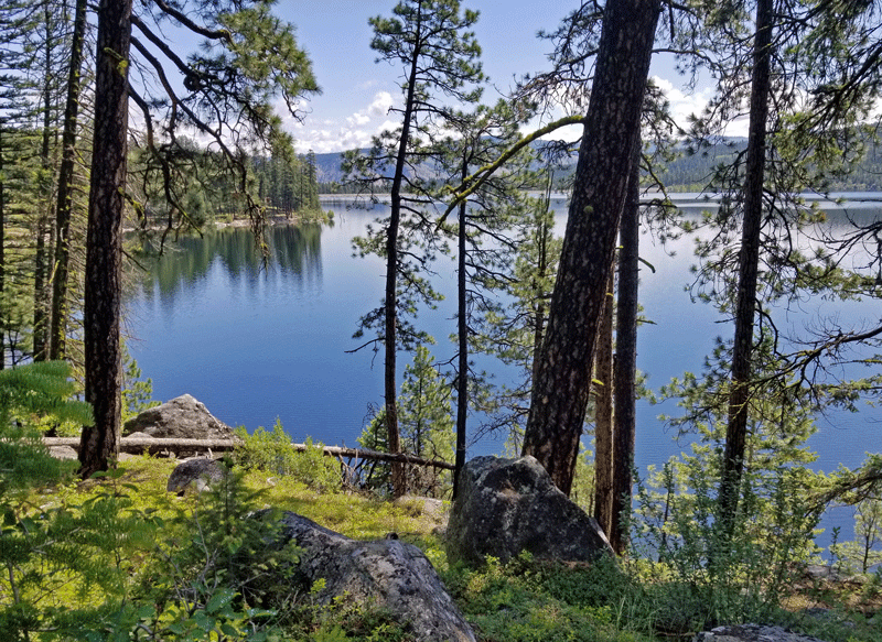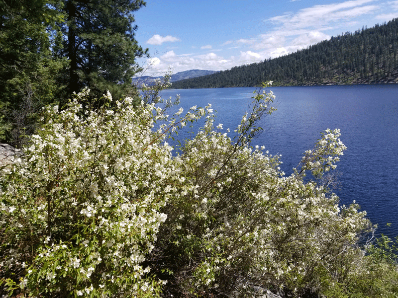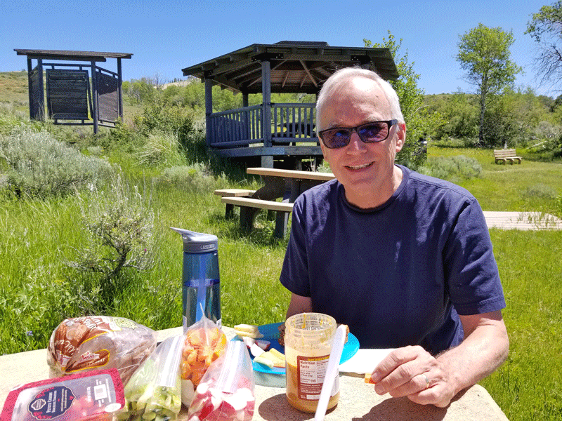 Fortunately, the weather improves in the 35-mile stretch after the pass, so we’re on track to enjoy an easy 2-hour hike along the lakeshore, followed by our usual picnic lunch – peanut butter sandwiches, cut-up vegies, and fresh fruit.