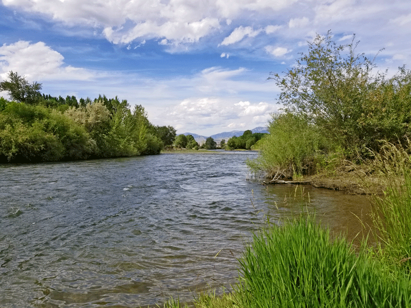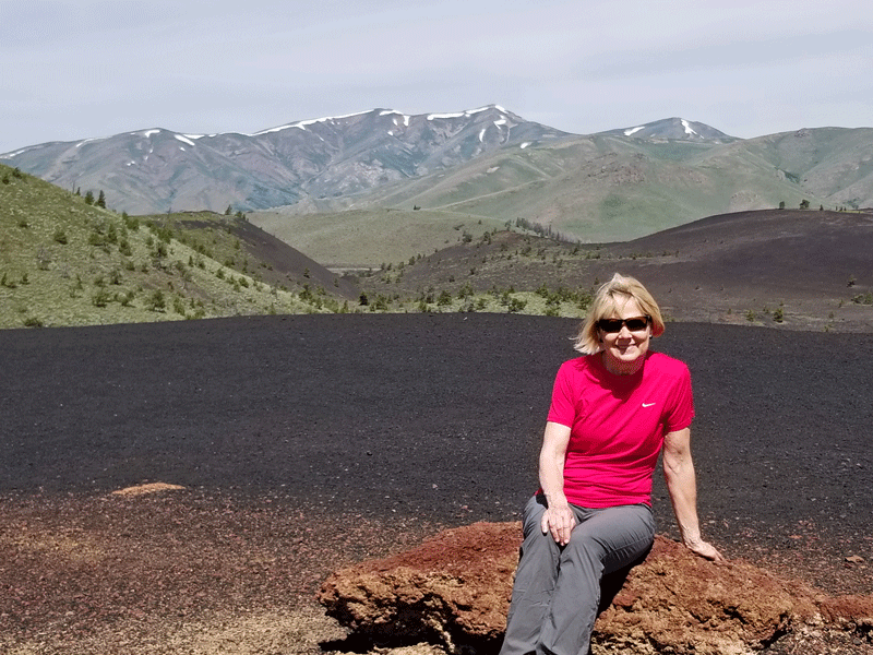 It’s a relatively short drive between Arco and Salmon, so we stop for a 3-mile round trip hike to Lower Cedar Creek Falls outside the small town of Mackay. Good plan, but it doesn’t work out when we can’t locate the trailhead. Instead, we find ourselves crossing a dry and rocky creek bed – not even sure it’s a road. Pretty views, however!