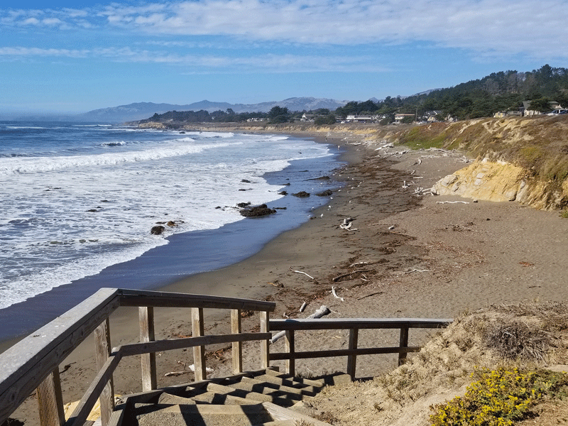 Moonstone Beach, located just outside Cambria, is part of Hearst San Simeon State Park. A boardwalk on the bluff runs the length of the beach and features lovely views of the rocks, tide pools, and ocean waves.