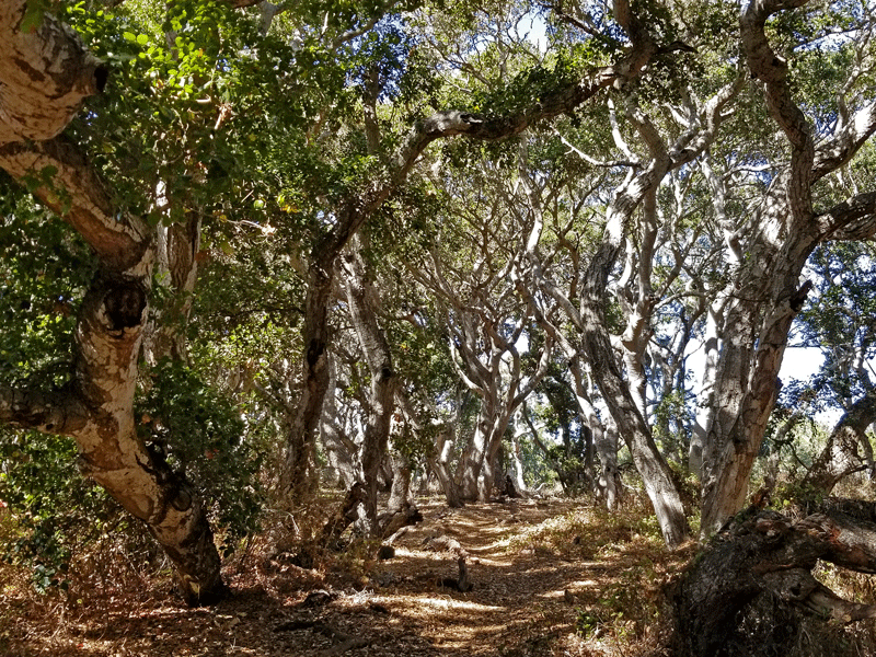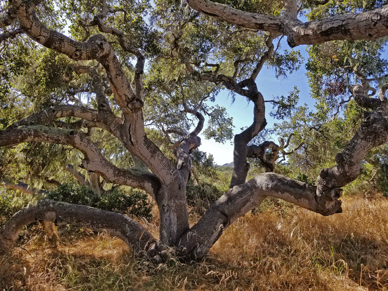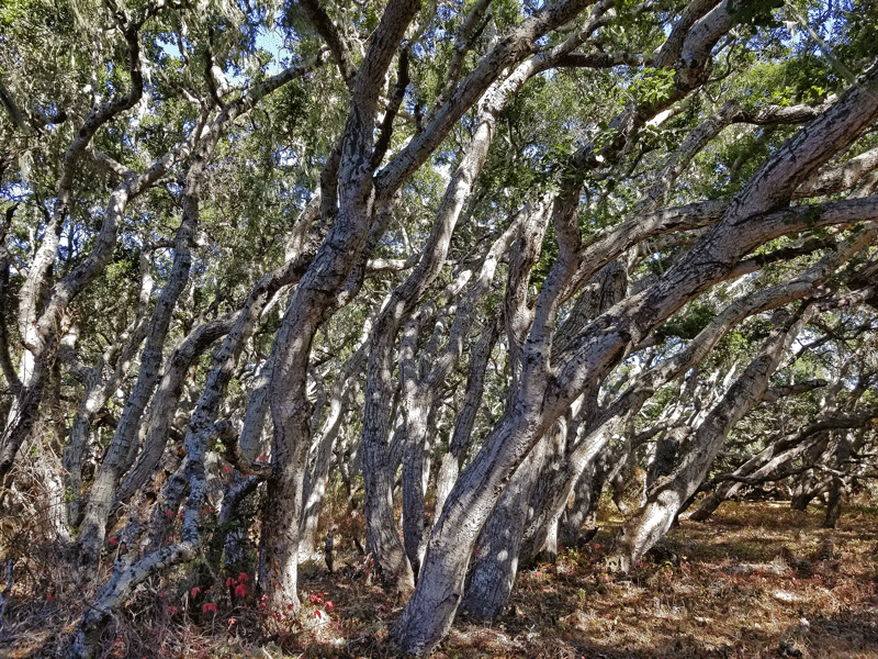 Years ago, coast live oak trees were widespread along the coast of California but gradually disappeared due to clearing, grazing, firewood cutting, and development. This 90-acre grove of dwarfed live oaks – an island surrounded by residential neighborhoods in the town of Los Osos – has been protected since 1972. The multi-trunk trees with seriously gnarled branches are around 800 years old and average 20-25 feet in height.