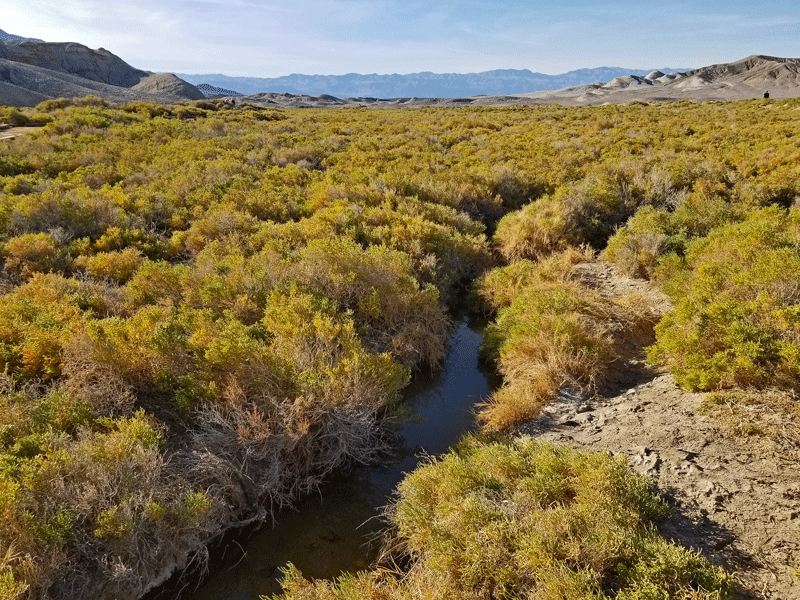 This area is home to the Salt Creek pupfish, a tiny silver-colored fish found only in Death Valley. Pretty sure the vegetation is called pickleweed.