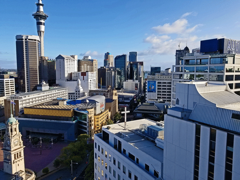 Our compact (a/k/a tiny) rental unit was conveniently located about one kilometer from the waterfront in the heart of the downtown Auckland business district, across the street from Aotea Center (performing arts and events center) and Aotea Square (open-air concerts, markets, political rallies, and other gatherings). The view from our balcony on the 18th floor: