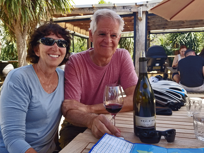 There are about 30 small wineries tucked into the hills of Waiheke, and our objective was to visit five. We rented electric bikes to get around the island – a first for all of us. They were wonderful, but a little terrifying until we got comfortable with the “surge” that propels you up the hills. Not to mention the challenges of riding on the left for the first time, dealing with the surprisingly busy main road, and trying to navigate the map. By the time we arrived at Obsidian, our first winery (only one wrong turn along the way), we were ready to relax!