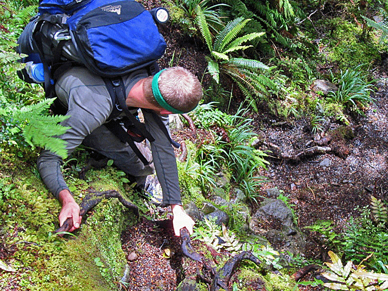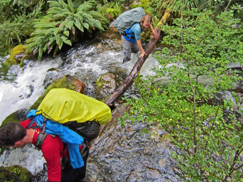 “heavy rain . . . most remote track in NZ . . . middle of nowhere . . . wet rocks and roots covered in a fine, slimy moss . . . mud holes that varied from ankle deep to knee deep . . . six days of rain . . . climbing straight up and down mountains using all available hands and feet . . . raging rivers and waterfalls . . . out of food . . . tricky if not a bit dangerous . . . water crossings up to my chest . . . awesome fun!”