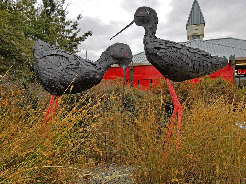 Metal sculptures of kaki (black stilts) in the town of Twizel