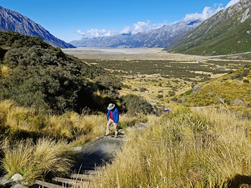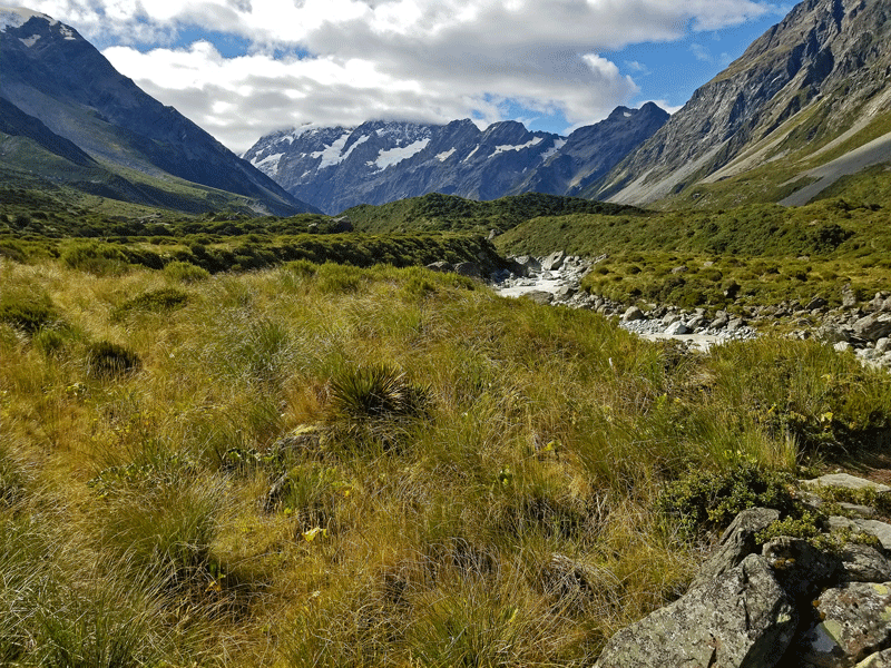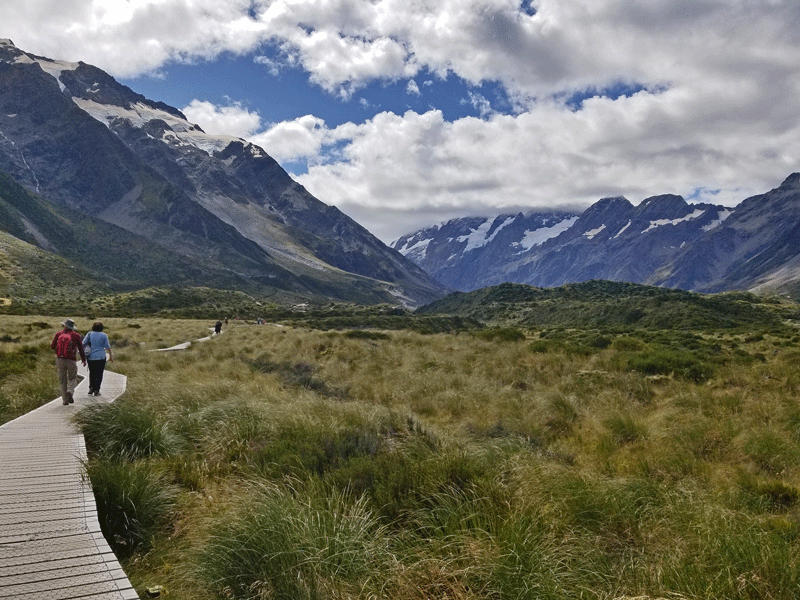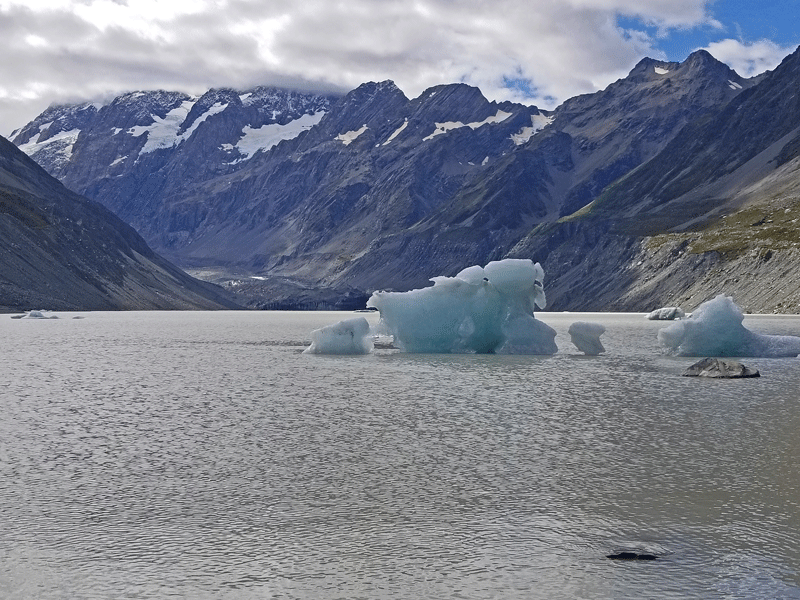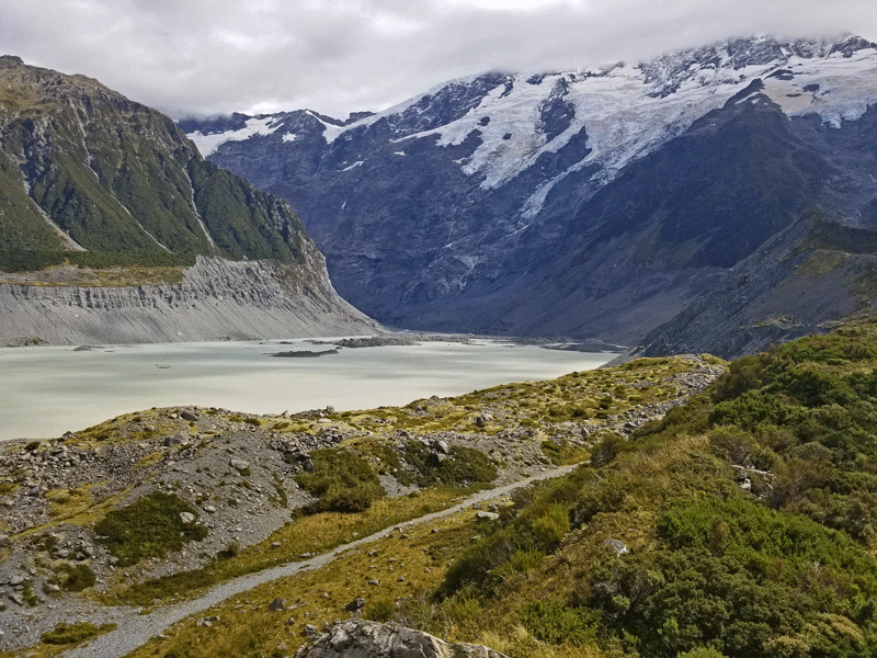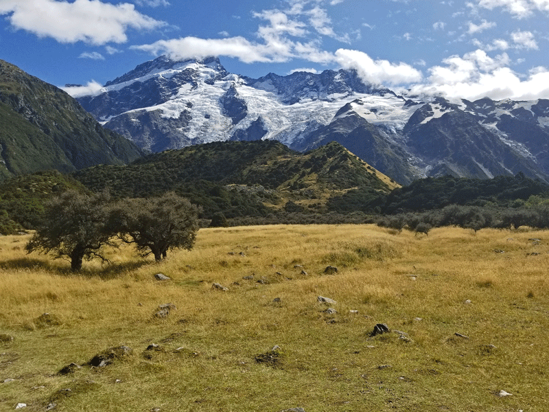 Located on the southeast side of the big mountains, Mount Cook Village receives about 4.5 meters (180 inches) of precipitation annually, and on average, it rains (or snows) nearly every other day. We were cautiously optimistic about having one sunny day during our three-day visit, and as it turned out, we got two.