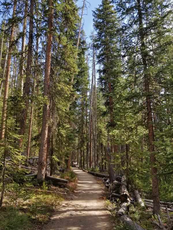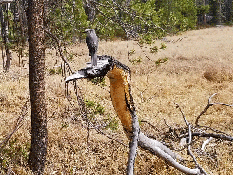 We hiked through forest en route to the meadow and were struck by two features. We weren’t at all surprised to see so many dead trees (both standing and fallen) – mostly lodgepole pines killed over the last 20+ years by a mammoth infestation of pine beetles. We didn’t, however, expect to see such an abundance of young, healthy conifers filling in the gaps. It was an encouraging sign that the forest is rejuvenating.
