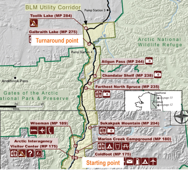 The trip map below was cobbled together from the BLM visitor guide to the Dalton Highway. Note that as you head north from Coldfoot, the highway threads the needle between Gates of the Arctic on the west and the Arctic National Wildlife Refuge on the east. Our turnaround point was at mile marker 275 for Galbraith Lake – exactly 100 miles from where we started.