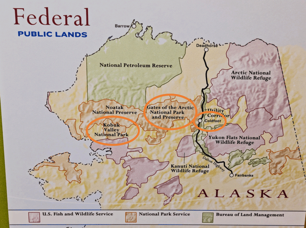 The map below shows the location of the two national parks in relation to Coldfoot.