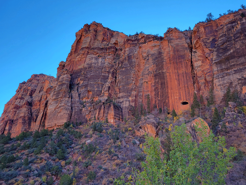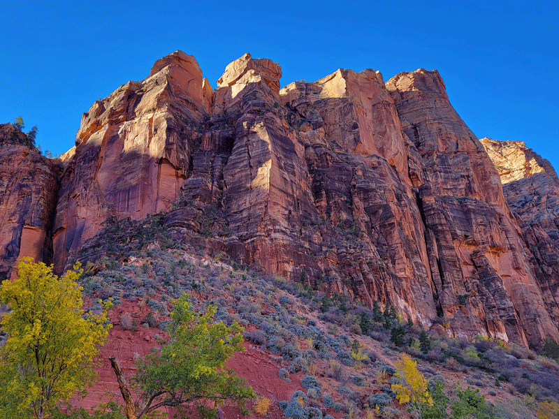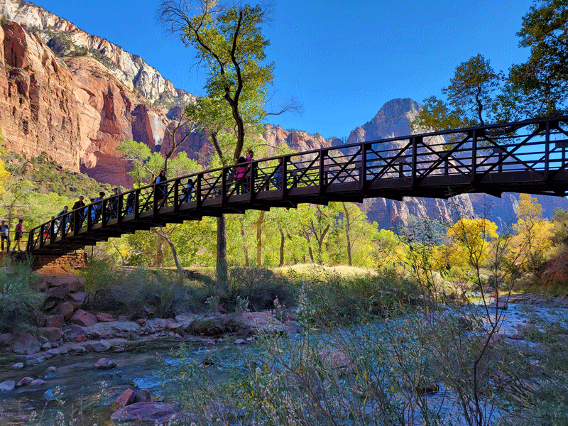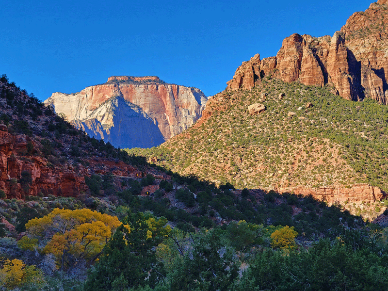 And as you might expect, Zion doesn’t lack for visitors – about 4 million a year (fourth highest among national parks), and it was plenty busy on the picture perfect day of our visit in early November. Approaching the entrance from the east side, we were in a steady line of traffic with limited or no parking availability at popular pullouts along the highway.