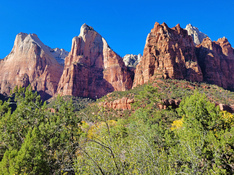 With only one day for our visit, we wanted to hit as many highlights as possible. Entering Zion from the east side, the scenery extravaganza starts immediately with views of giant rock cliffs in an array of colors and patterns.
