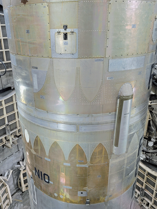 The Titan II missile housed in the silo contains neither fuel nor warhead, and the reentry vehicle has a prominent hole in the side to prove it is inert. The photo below was taken looking down at the missile from the outside of the silo – you can easily see the hole near the top that renders it unusable.