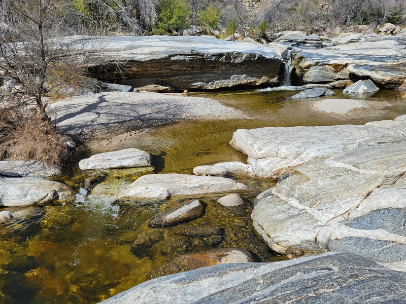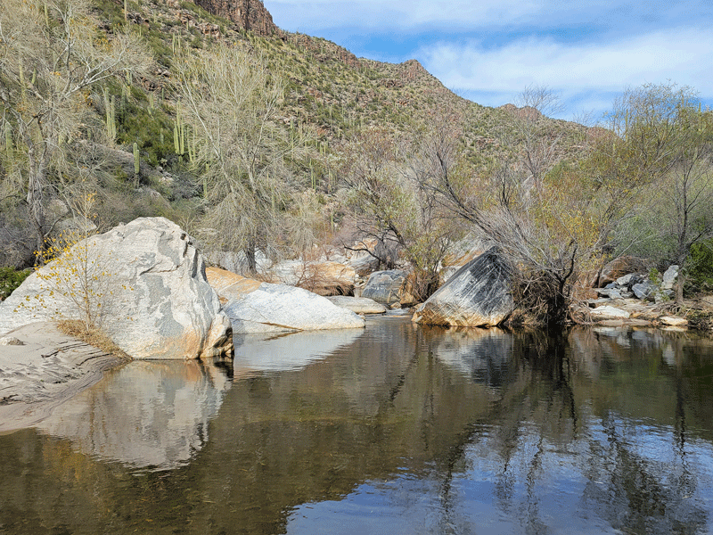 Unlike many waterways in Arizona that don’t actually carry water except during the summer monsoons, Sabino Creek flows year-round, fed by rainwater and snow-melt from Mt. Lemmon and other nearby mountains.
