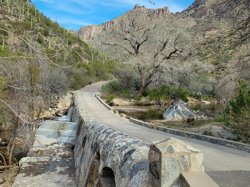 The short road up the canyon was built in the 1930s by the Civilian Conservation Corps (CCC), with aspirations of eventually extending it to the top of 9,171′ Mt. Lemmon. That plan was abandoned at some point, but the original section remains, including a small dam and nine beautiful stone bridges that were constructed along Sabino Creek.