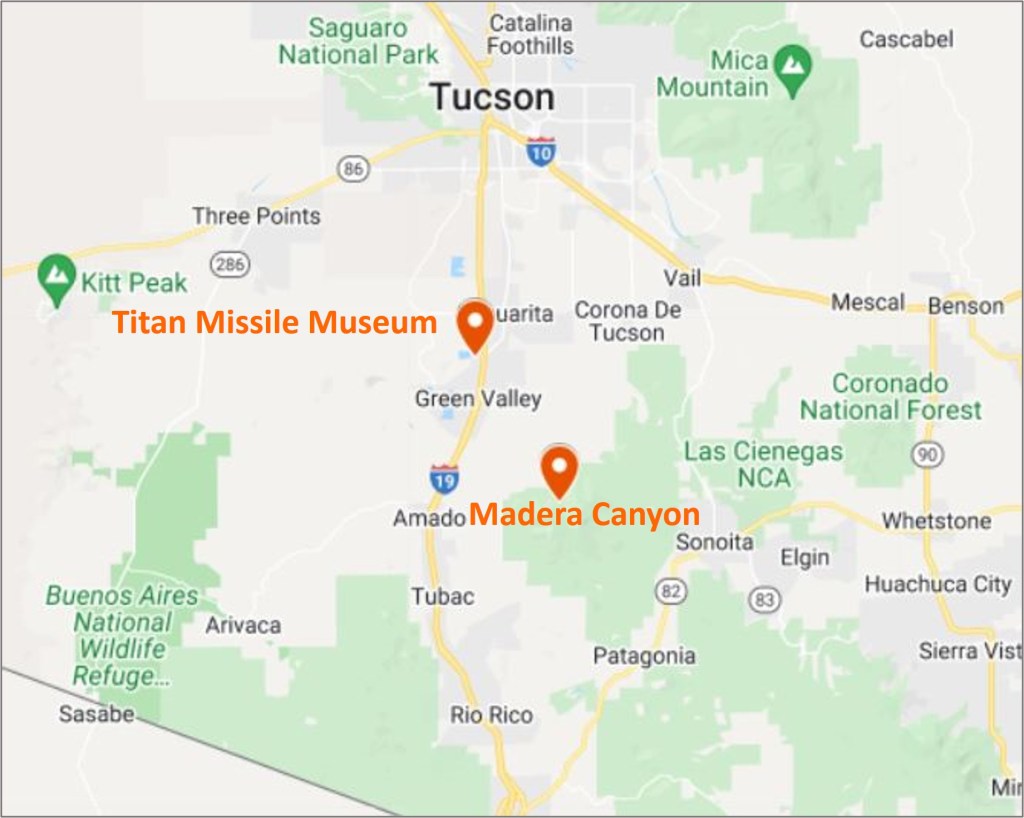 We were surprised to discover that Madera Canyon looks and feels like the foothills of Colorado, with Ponderosa pines and gambel oak trees no doubt providing respite from the intense heat of the Sonoran Desert during the summer. It’s about an hour’s drive from Tucson and not far from the Titan Missile Museum.