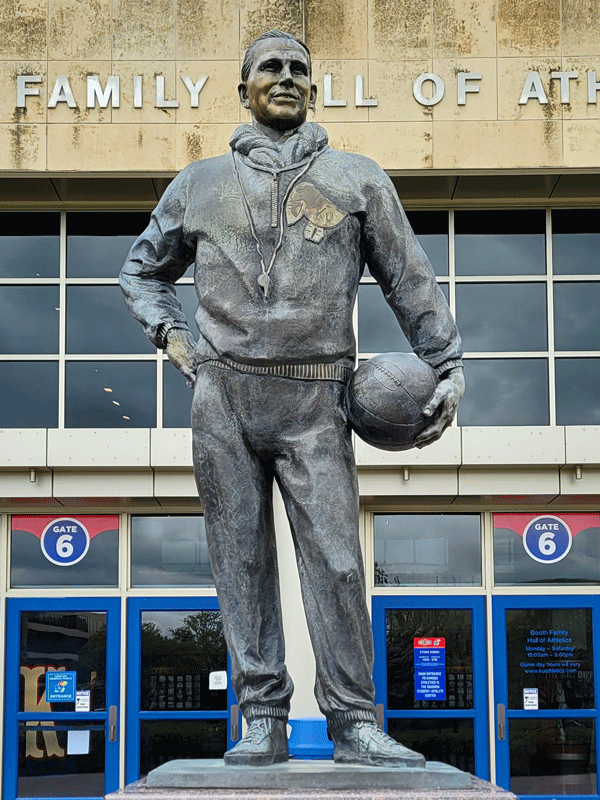 Phog Allen, who was a player on Naismith’s basketball team, is equally legendary at KU, having served as head basketball coach for 39 years with a list of accomplishments that included 24 conference championships and three national titles. He retired from coaching in 1956 and lived in Lawrence until his death in 1974.