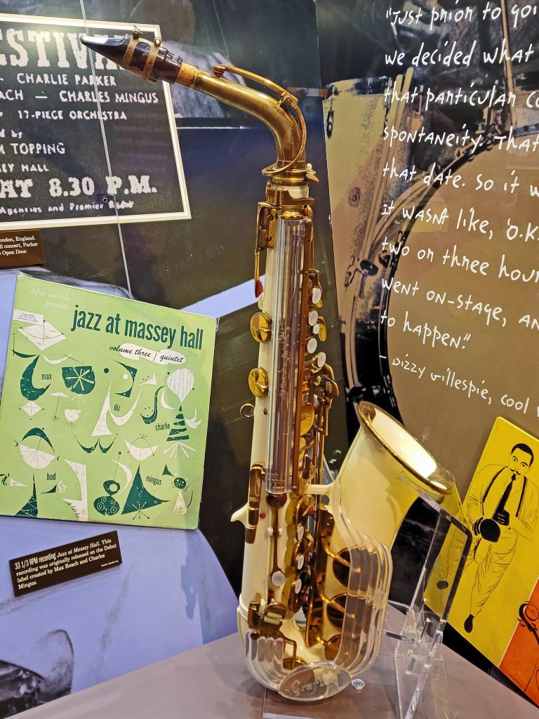 Visually, there was a lot going on in the intimate museum space, and I only got a few decent photos. The first one is the plastic saxophone Charlie Parker played in a now-famous 1953 concert in Toronto with fellow performers Dizzy Gillespie, Bud Powell, Charles Mingus and Max Roach.