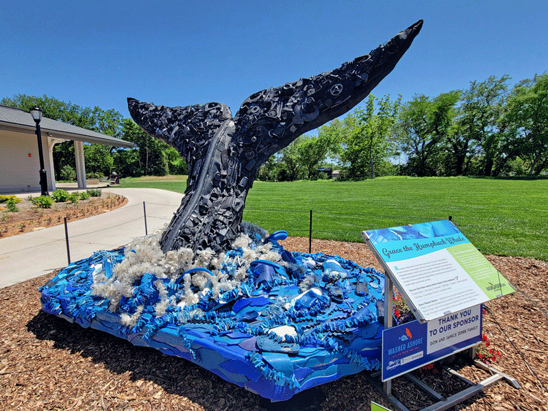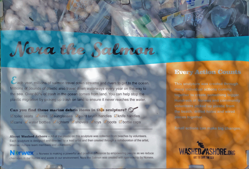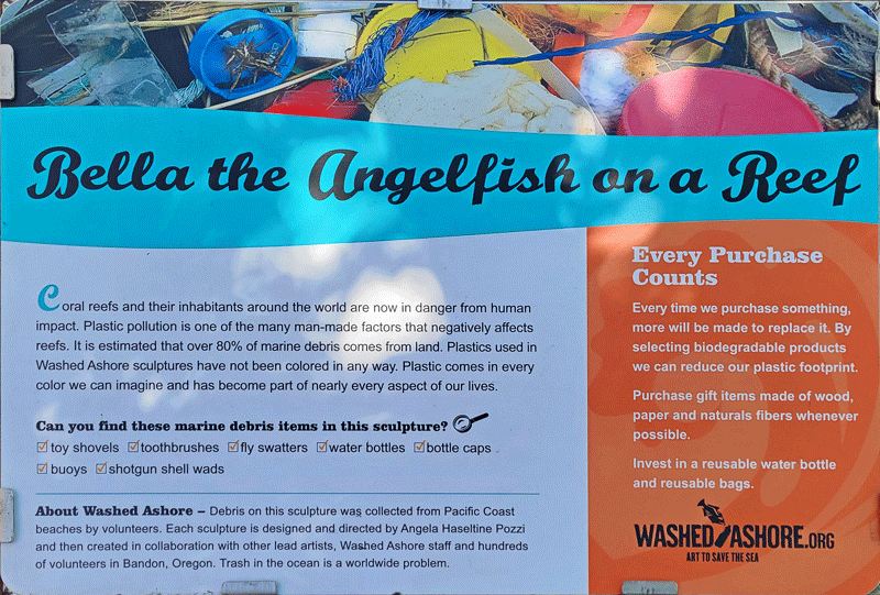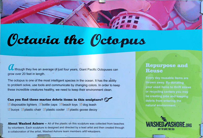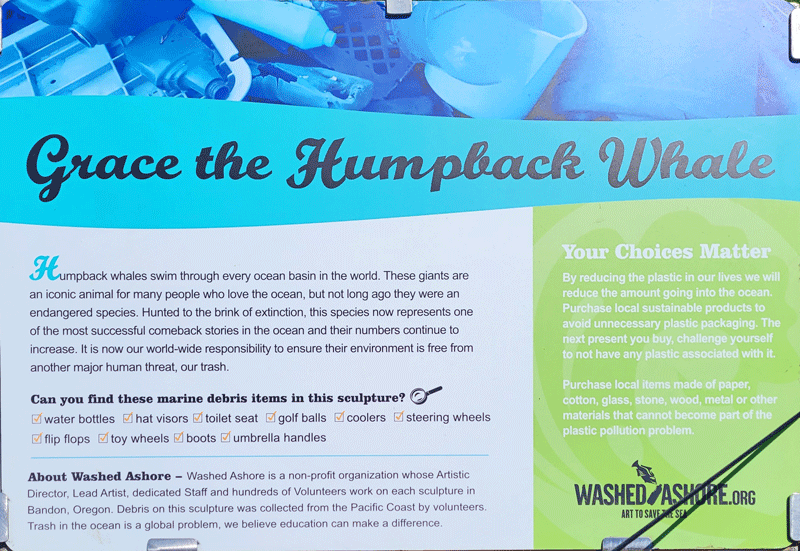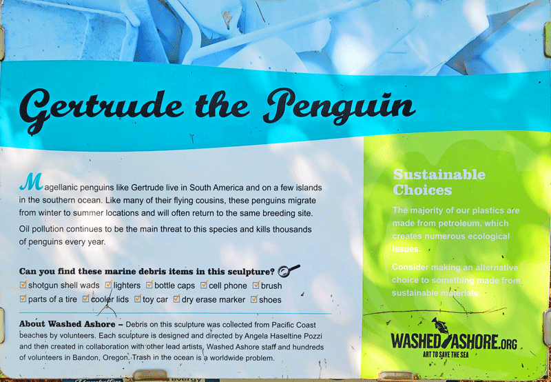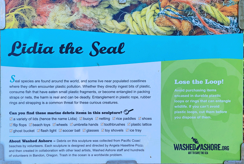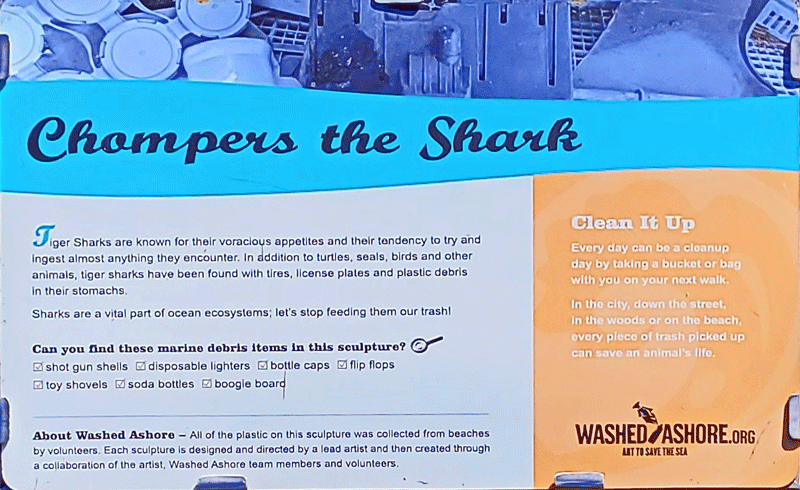 The sculptures are indeed very large, and the trash they contain is mind-boggling. Hopefully, they make an impact on people’s awareness and behavior. I’ve included photos of eight in the gallery below, along with their informational display boards. You should be able to click anywhere in the gallery to bring up a slide show of enlarged photos.