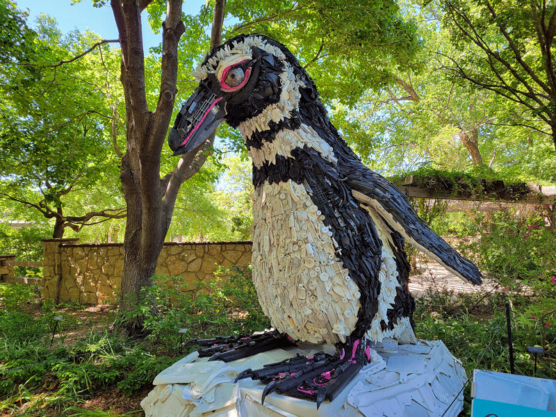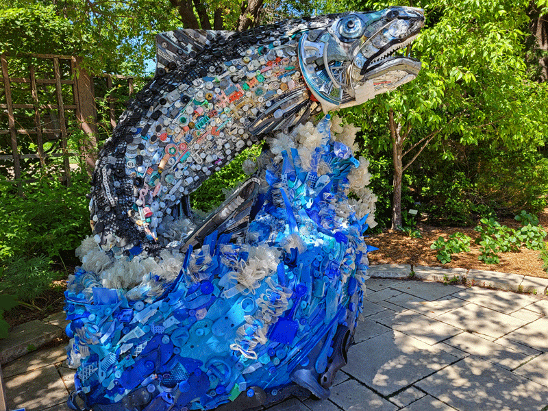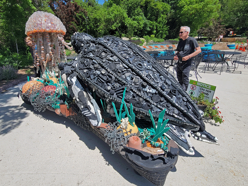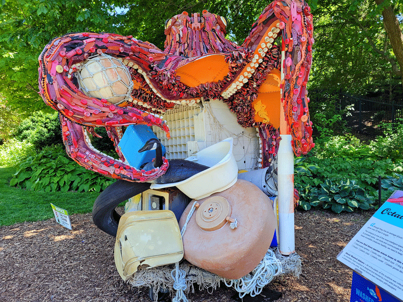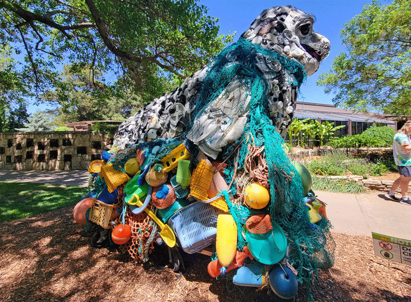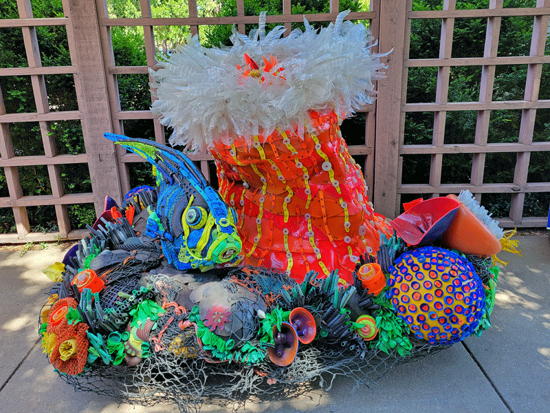 The most engaging exhibit at Botanica was a traveling installation called “Washed Ashore: Art to Save the Shore,” a collection of 14 giant sculptures constructed of marine debris from the Pacific Northwest. Washed Ashore is a not-for-profit organization focused on combating plastic pollution in the oceans through art and education. In ten years, they have created 85 works of art using 35 TONS of plastic waste found on the beach.