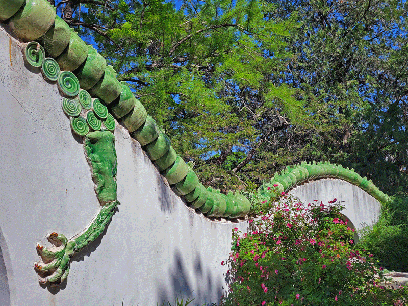Before leaving Botanica, we meandered through the Chinese Garden of Friendship, a small, aesthetically pleasing spot just inside the entrance. We noticed the interesting architectural elements but didn’t do enough research ahead of time to fully appreciate the work that went into creating this lovely feature.