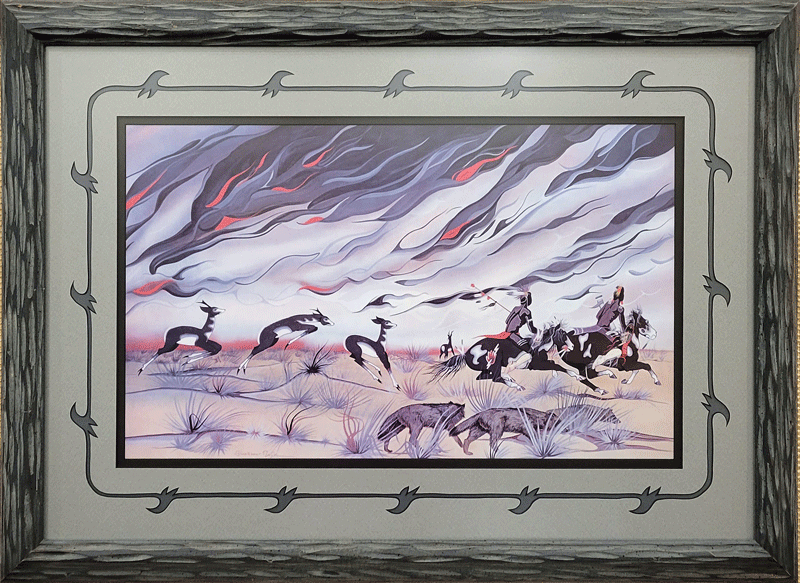 “Prairie Fire” (shown below) was Bosin’s most acclaimed work, having won a prestigious art award in 1953 and later featured as the centerfold in the May, 1955 issue of National Geographic. The piece also travelled to Washington, D.C., where it was displayed at both the White House and the Smithsonian Institute during the 1960s.