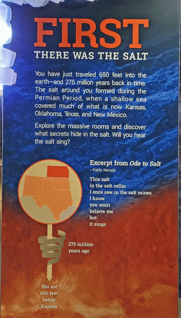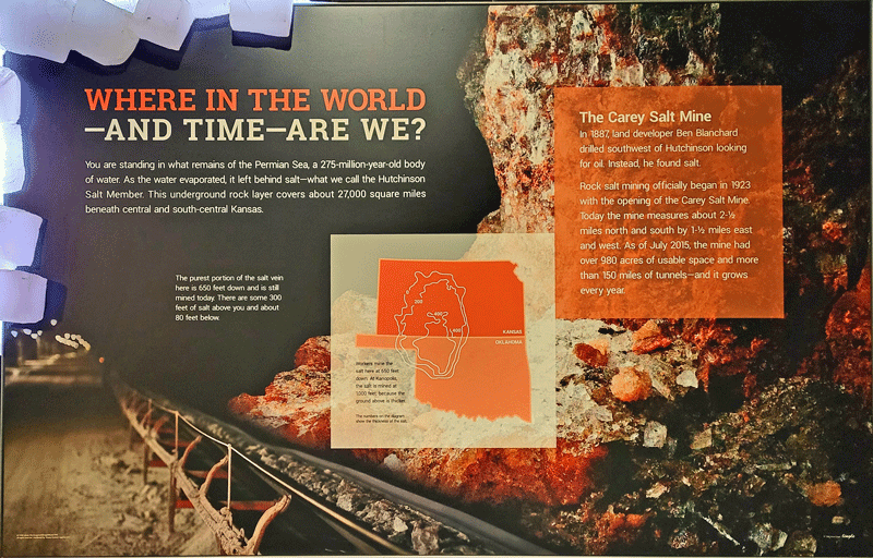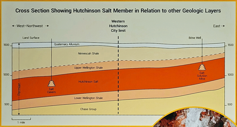 About 275 million years ago, the Permian Sea included a large part of present day Kansas, and salt deposits formed as the water evaporated. The salt layer lies 500-1,500 feet below the surface and is hundreds of feet thick.