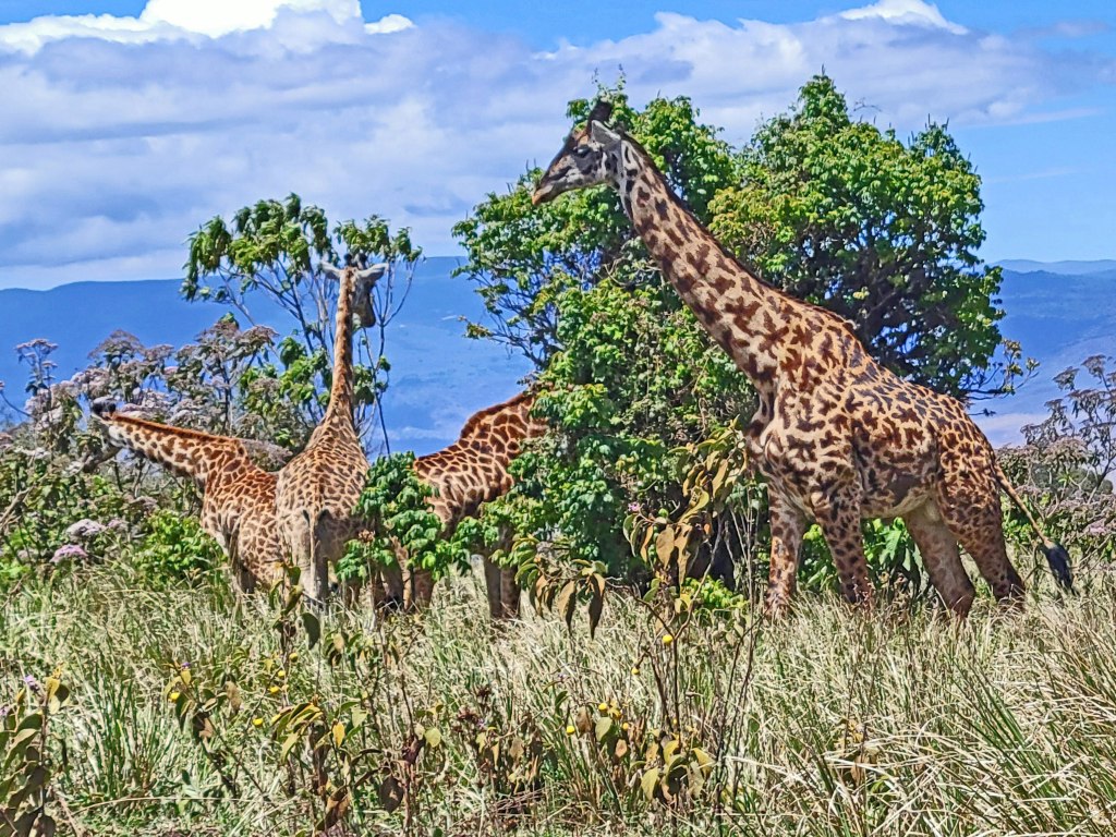 There are no giraffes living on the crater floor, but they were nearby. We ran into a herd that lives higher up close to the rim where our lodge was located.