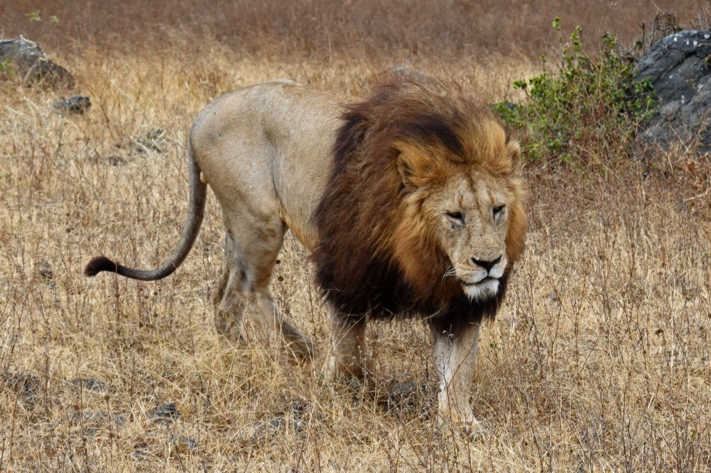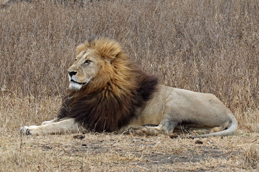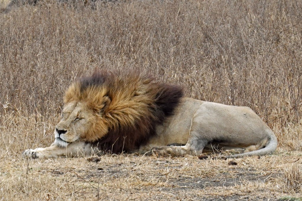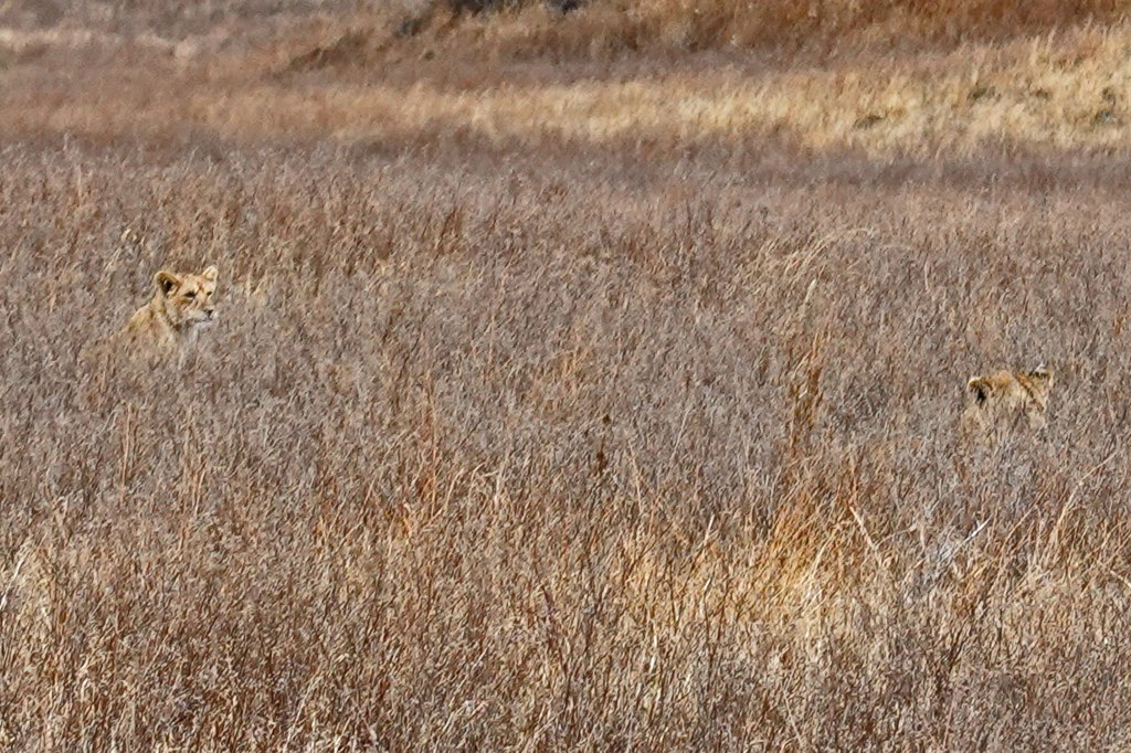 Without a doubt, one of the coolest sights ever. Our guide then pointed out at least two lions (mom & cub, perhaps) farther away, most likely his family. And difficult to spot in the tall grass. Two photos – in the distance and a little more zoomed in.