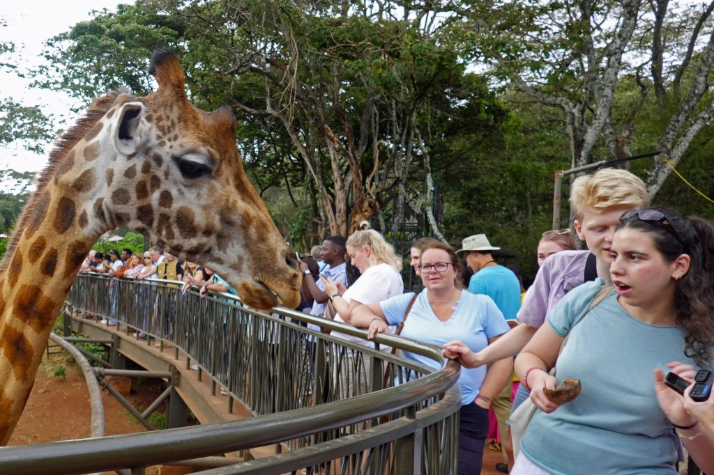 A visit to the Giraffe Center is a ‘must do’ for tourists in Nairobi. There’s an educational component involved, of course, and it’s also fun. A raised viewing platform allows visitors to cozy up to the friendly giraffes just looking for a snack. As you can see, one woman was a little taken aback by the experience. (She wasn’t part of our group.)