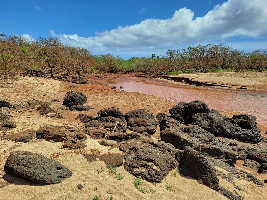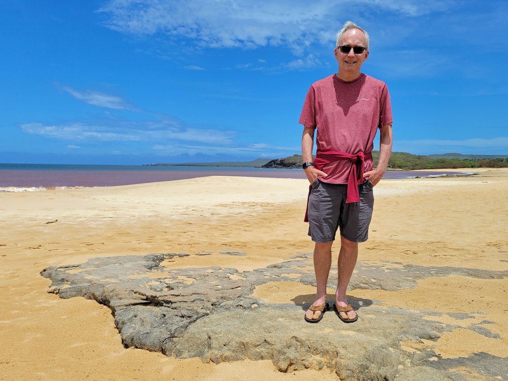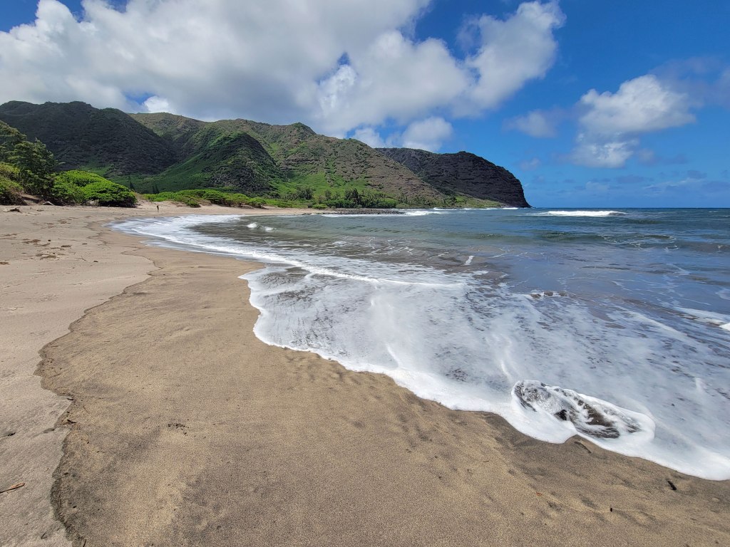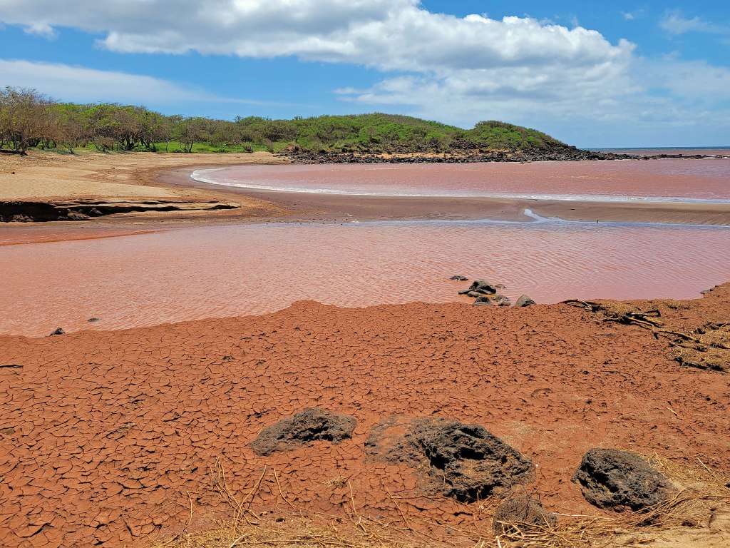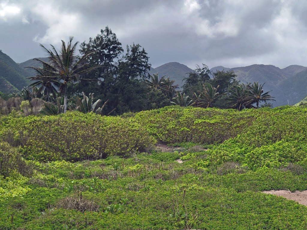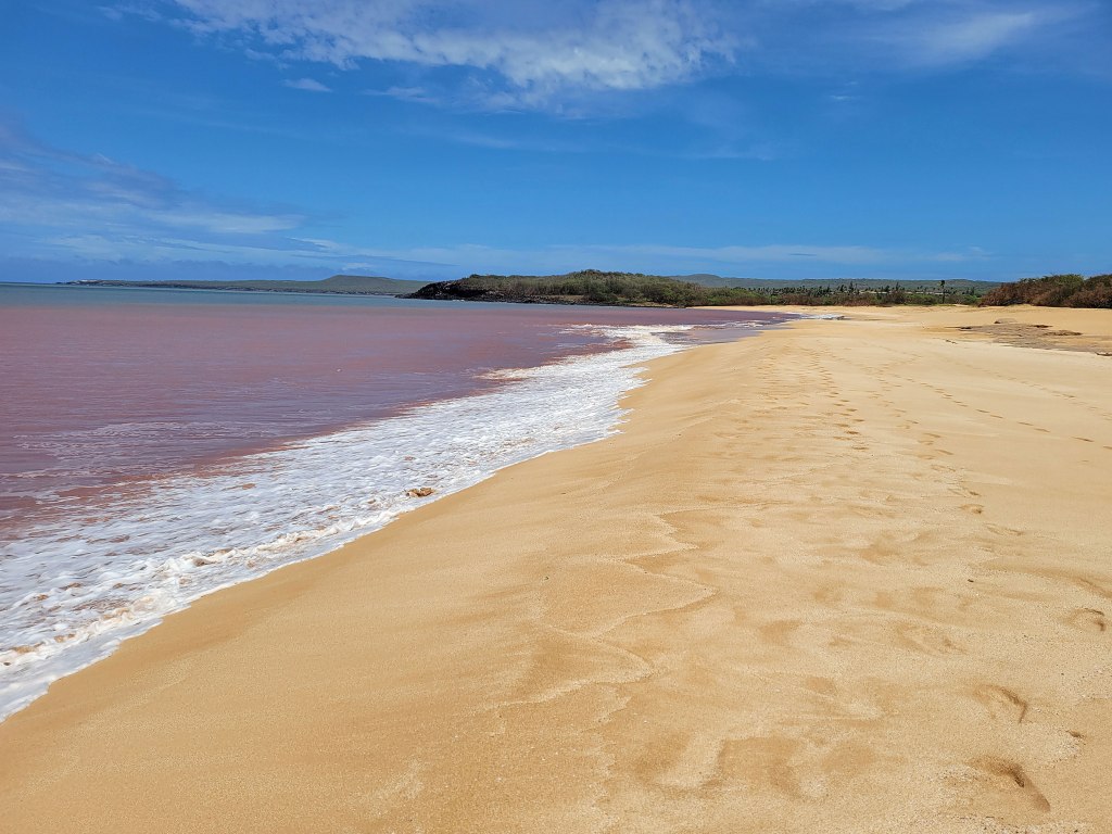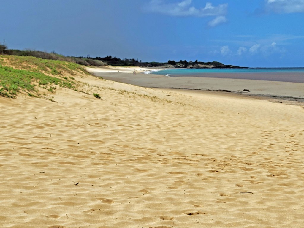 Little has happened on the west side of the island since that time, so after 25 years of neglect, the vegetation is an overgrown mess and the infrastructure – including a hotel and golf course – is crumbling. But oh my goodness, Pāpōhaku Beach is amazing – three miles long and up to 100 yards wide in places. No lifeguards, no amenities and virtually no people. Here’s how it looked on the north end . . . .