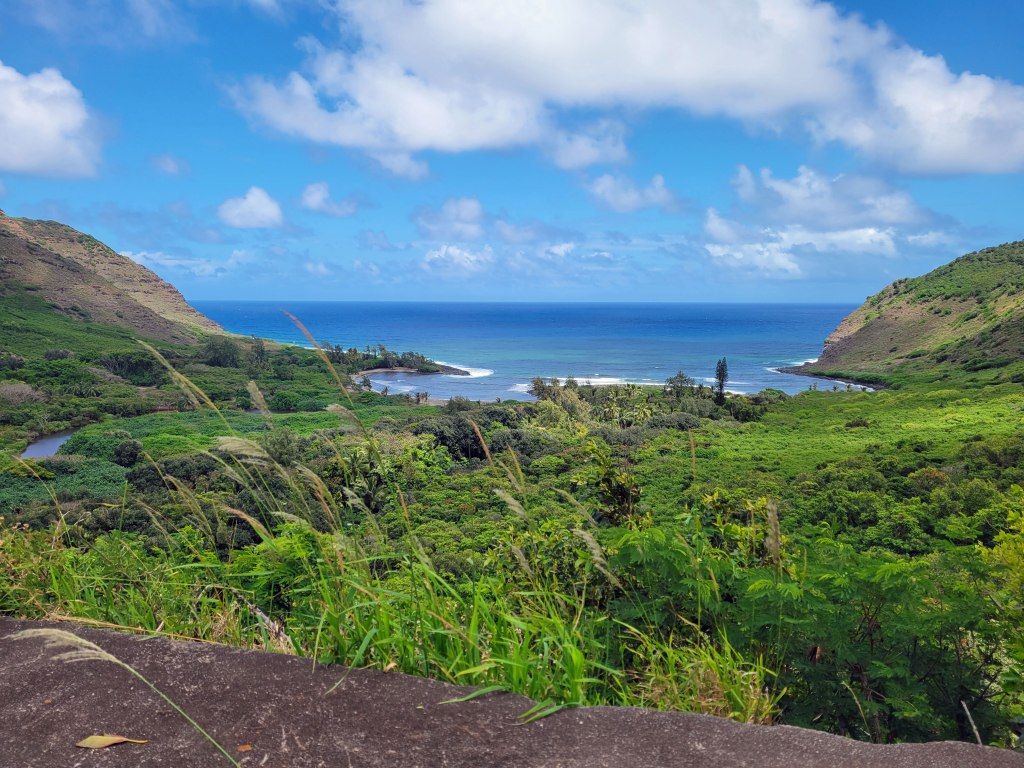 Ranging between 3,000 and 4,000 high, the sea cliffs on the north side of Moloka’i are advertised as the world’s highest. At the overlook, we got a glimpse of the daunting (and beautiful) landscape that continues for miles. We could also see the large, flat Kalaupapa Peninsula, now preserved as a national historical site.